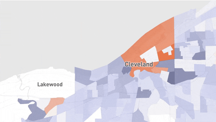 These changes are also reflected in our maps of eviction filing rates, which incorporate the new baselines. Specifically, if you select the “Relative to Baseline” option, the map now reflects a comparison between current filings and the post-pandemic baseline filings (see Figure 2 for an example in Cleveland). This update also affects our estimates of eviction filings by neighborhood racial composition when you select the “Vs. Baseline” toggle button.