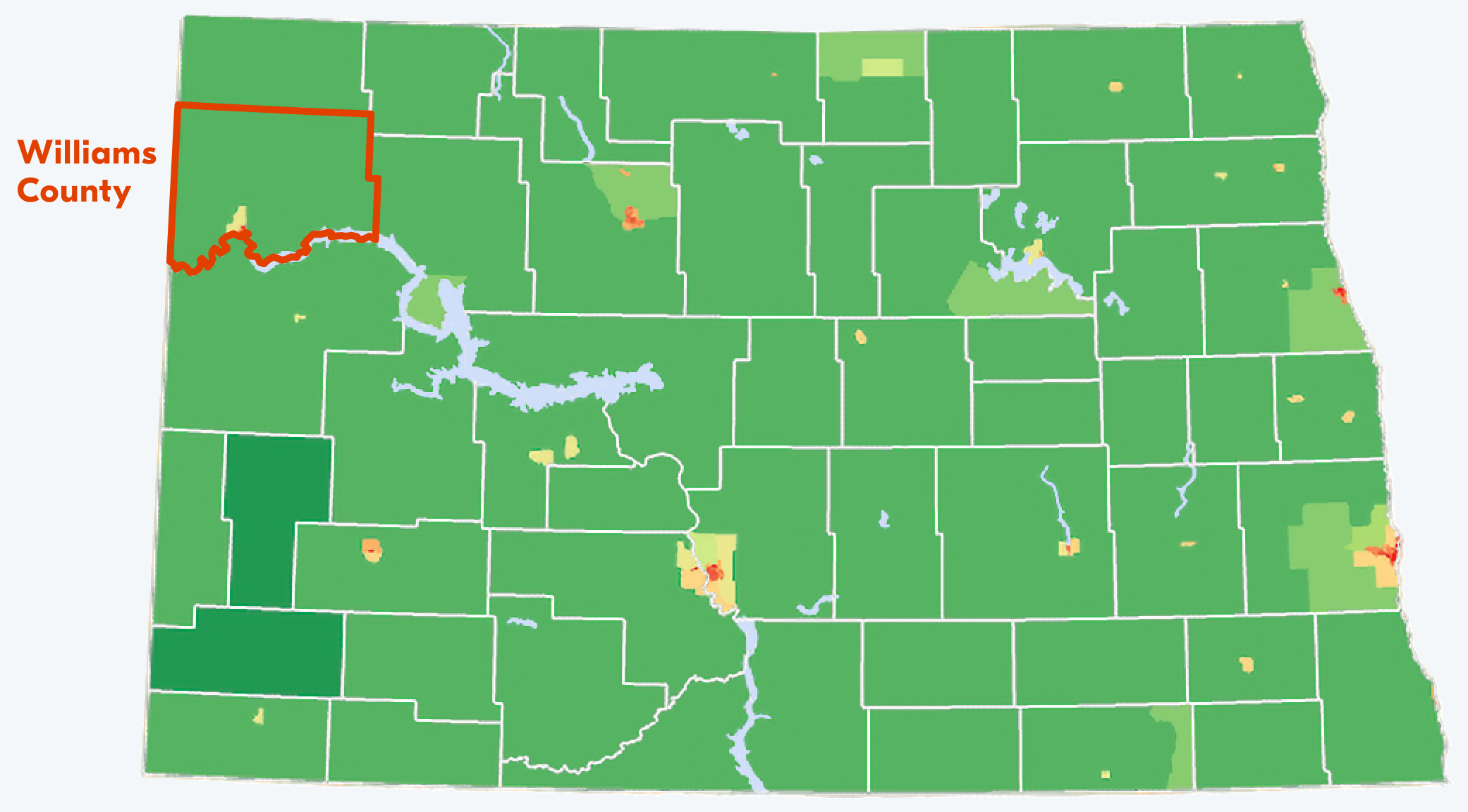 Williams County, North Dakota changed radically in just ten years. Its population doubled between 2010 and 2020 as new drilling technologies—including hydraulic fracturing, or fracking—enabled an oil boom that made this isolated corner of North Dakota one of the centers of the global oil trade. As investment flooded the region, wages increased from $55,000 a year to around $80,000. Many locals prospered as their property values went up and their businesses found new customers. But others suffered, especially those who found that the cost of living grew faster than their income.